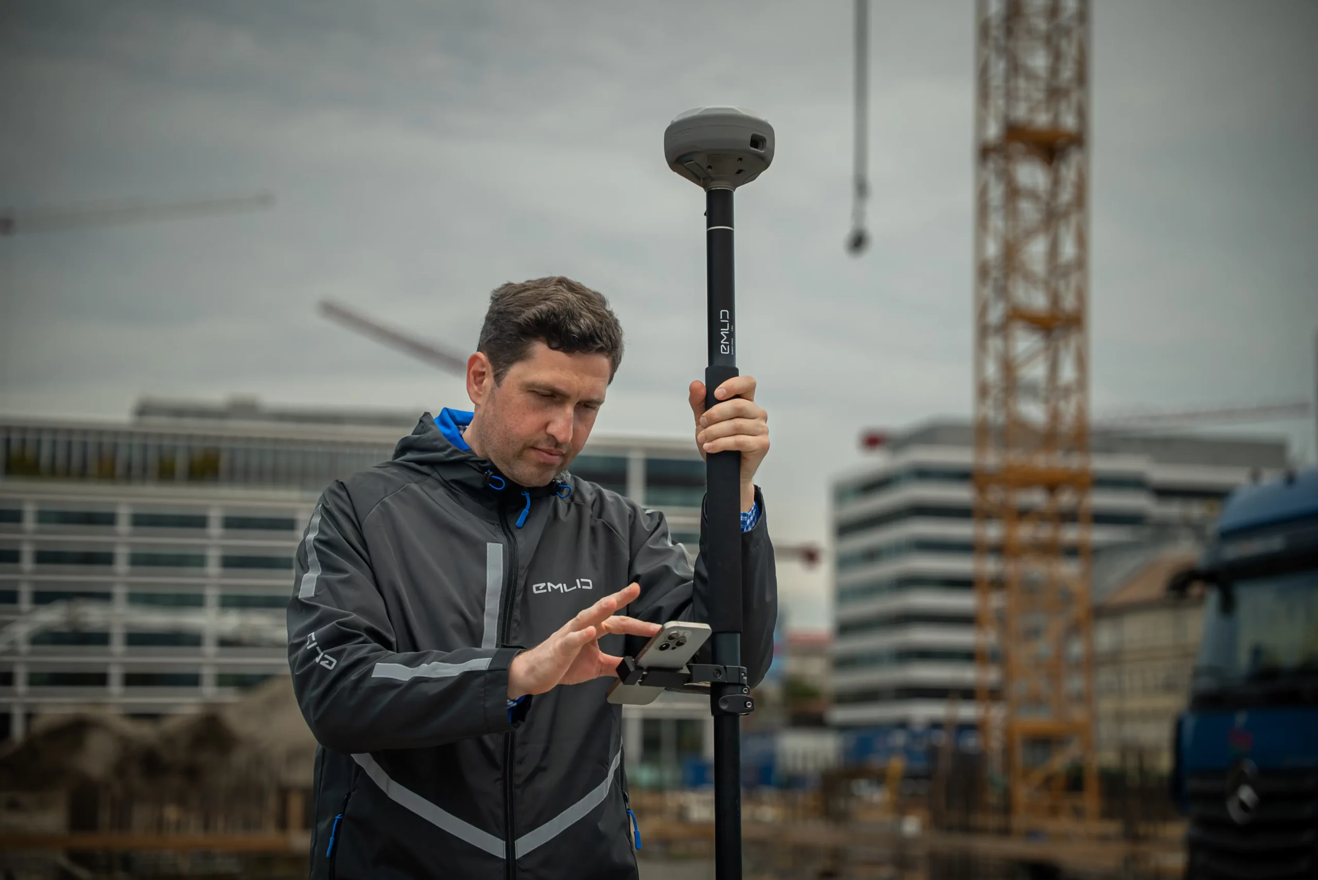 Implantation de points à distance grâce au Reach RS4 Pro et Emlid FlowUn Reach RS4 Pro sur un chantier en train de prendre des points à distance avec sa caméra réalité augmentée
