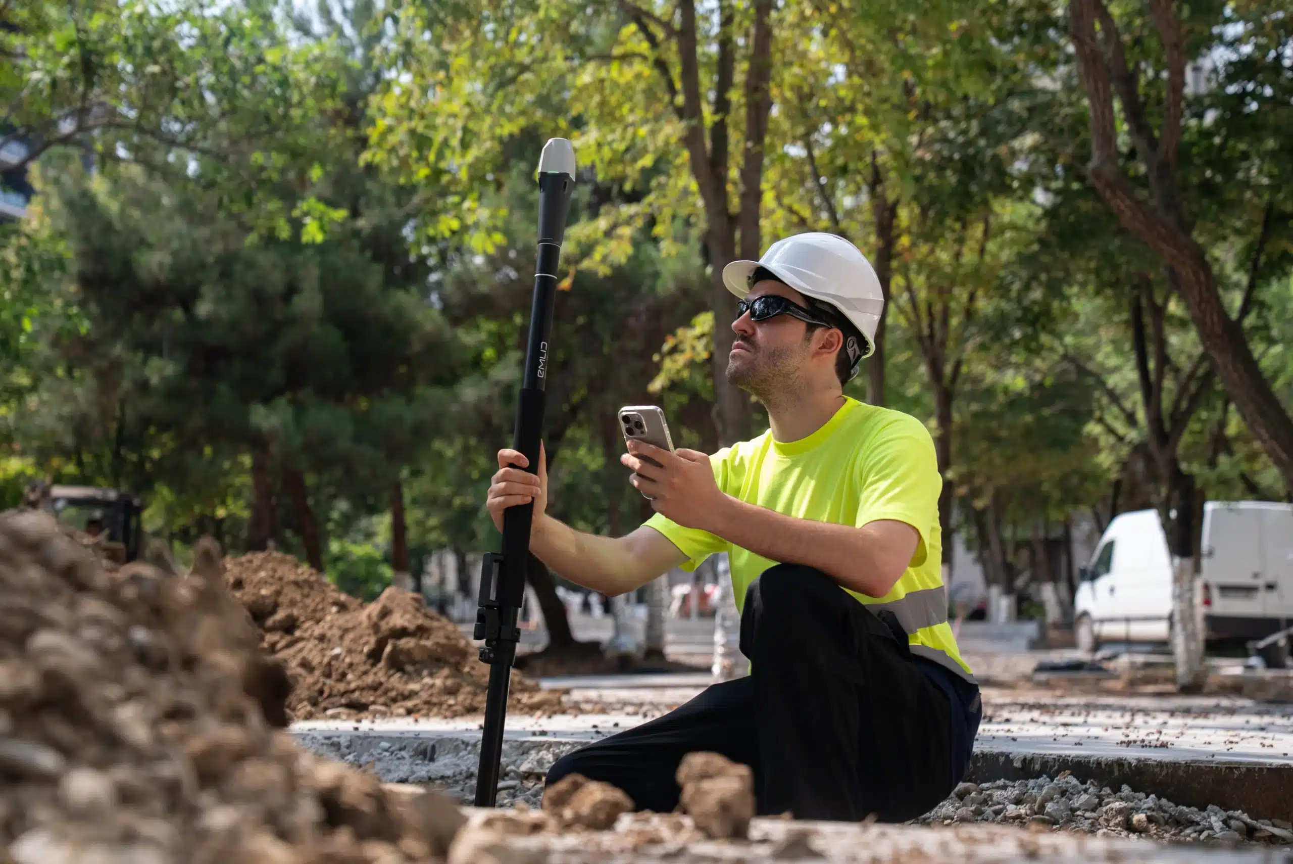 Reach RX2 avec canne EMLID et travailleur en gilet jaune et casque blancConnectivité simple et efficace